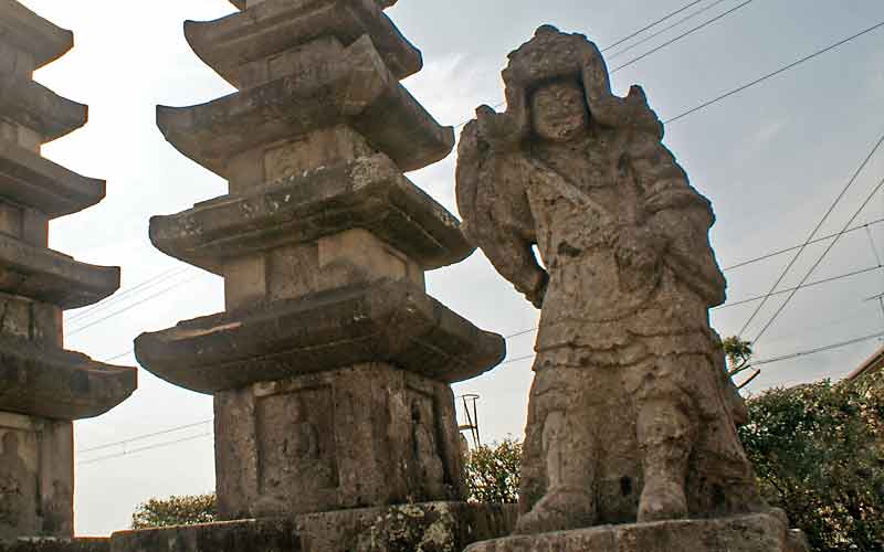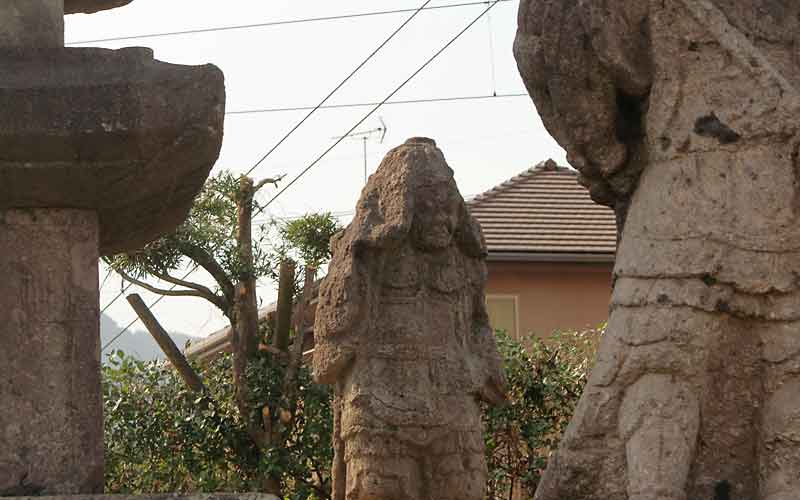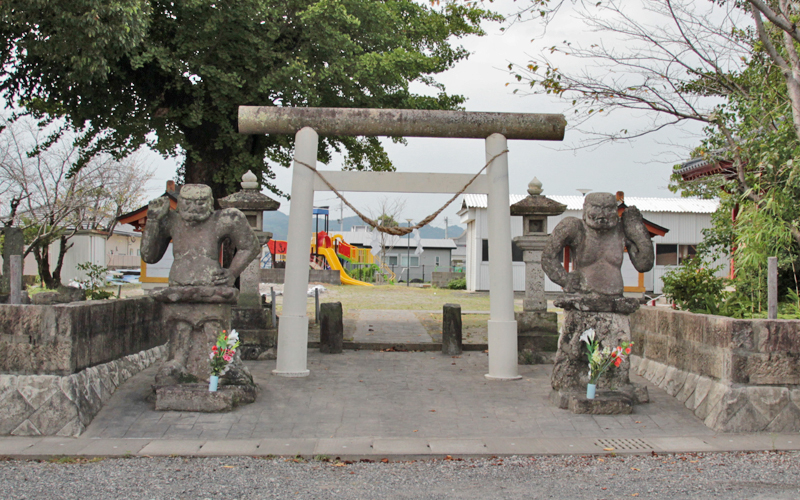 神社の入り口には、明治38年に用水路を通すとき掘り出された仁王像が立っている。