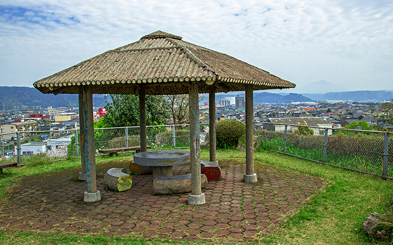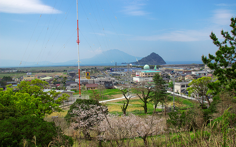 頂上からは隼人(浜之市)港、干拓地帯が一望のもとに見渡せ、その先には神造り小島、桜島が錦江湾に浮かぶ。