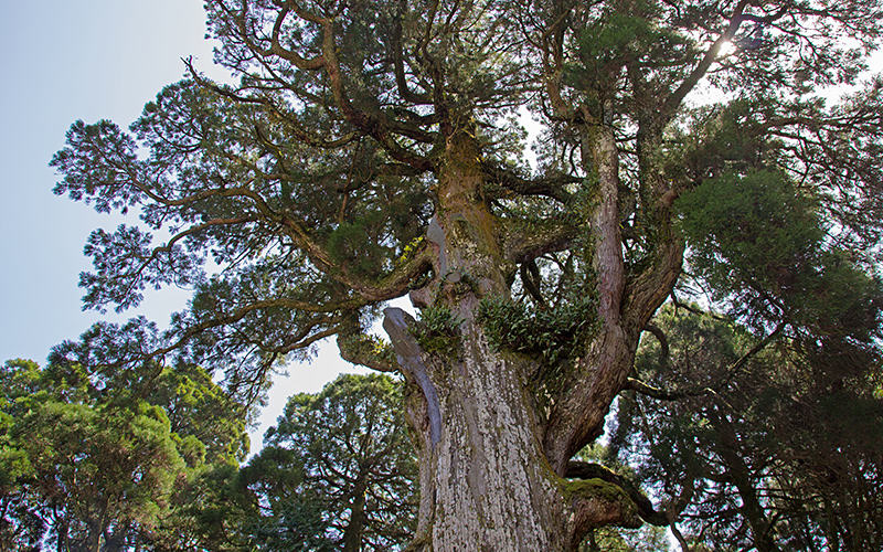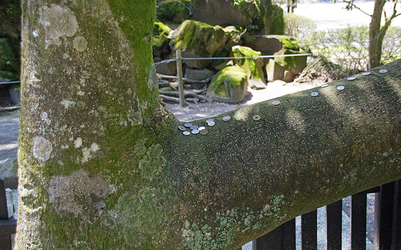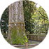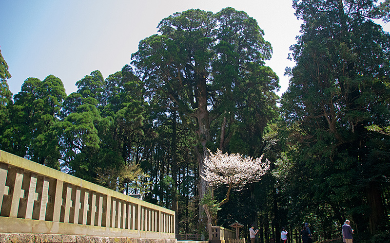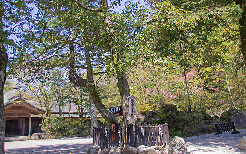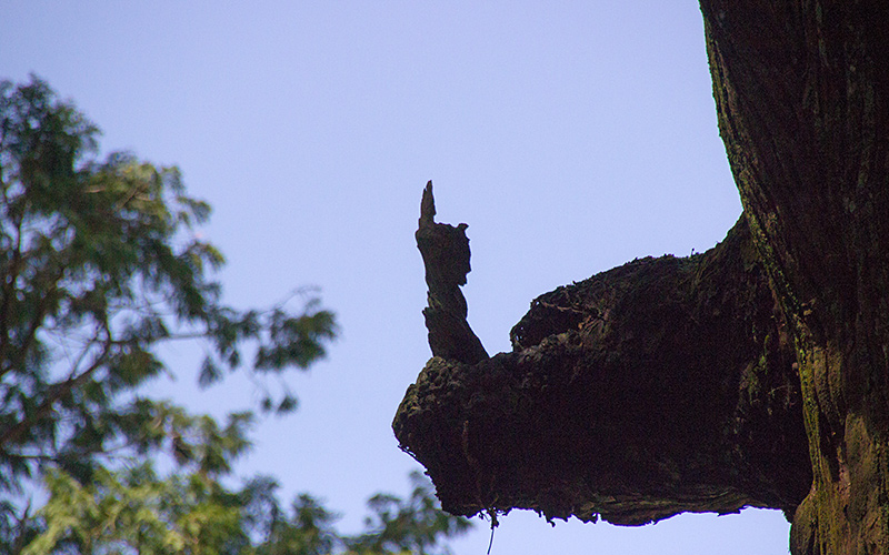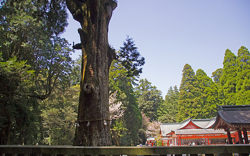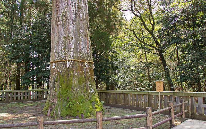 神宮社殿前庭の右隅にあり、樹高38.2m、幹回り6.8m、樹齢約800年の杉の木である。よく見ると神様が宿っていることがわかる。
