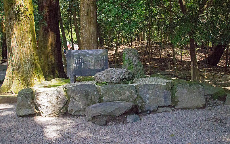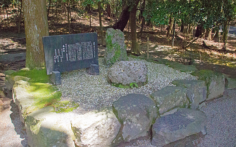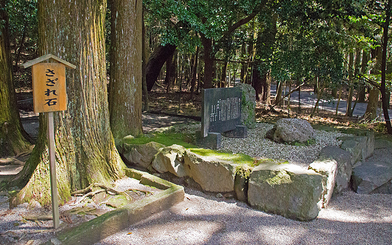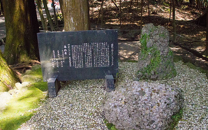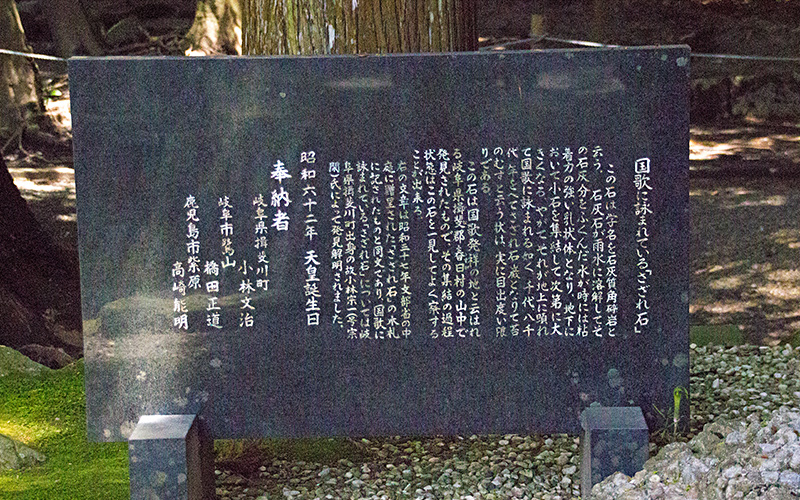 原産地岐阜県から奉納されたもので、国家「君が代」の歌詞にあるさざれ石とは小さな石のことで、巌は大きな岩のことである。「さざれ石の巌となりて苔のむすまで」と歌われているが、それは小さい石の一つ一つが寄り集まるといつかは大きな岩となるということである。国家も同じである・・・