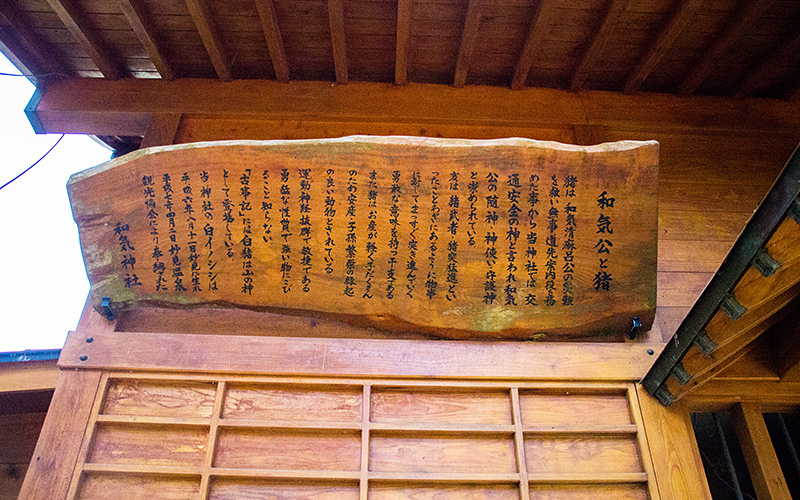 和気清麻呂公を祀る神社で、学問,建築,交通安全の神として知られている。清麻呂は、道鏡という僧の策略で大隅の国に流され、流れ着いた場所がこの辺りと言われている。流される途中、道鏡の使者に命を狙われ、白いイノシシの群れに助けられたという話が残っている。和気神社は、清麻呂を守護したとされるイノシシを神様の使いとあがめ、境内には狛犬の代わりにイノシシの石像が置かれている。昭和21年3月に建立された。