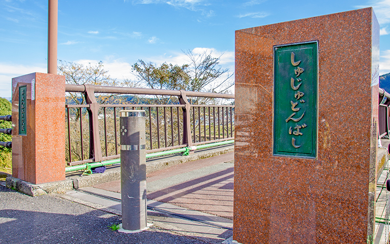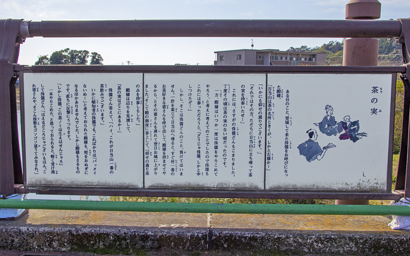 侏儒どん橋(歩道橋)の中央には侏儒どんのモニュメントと頓知話「茶の実(ちゃのみ)」のプレートが設けられている。日当山城、笑隈城、姫木城、橘木城を一望できる。