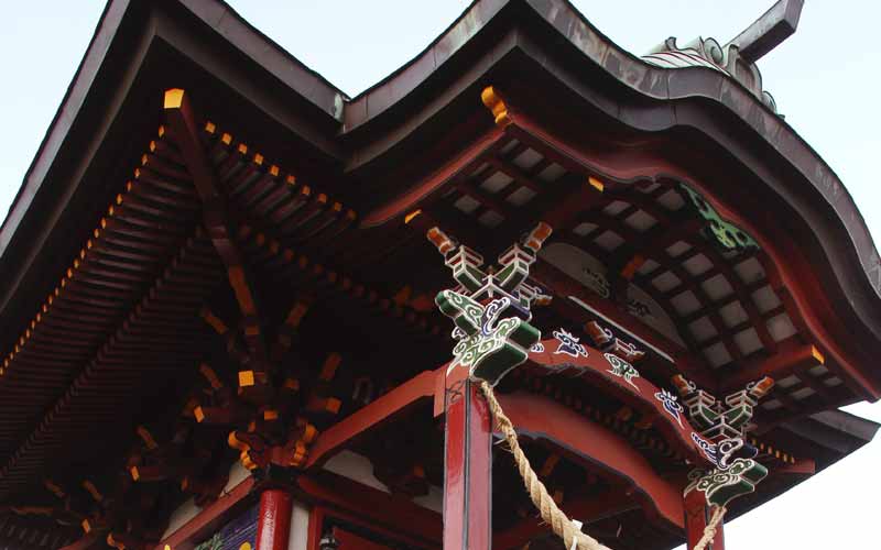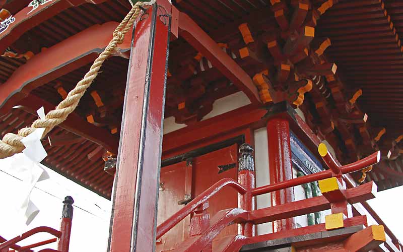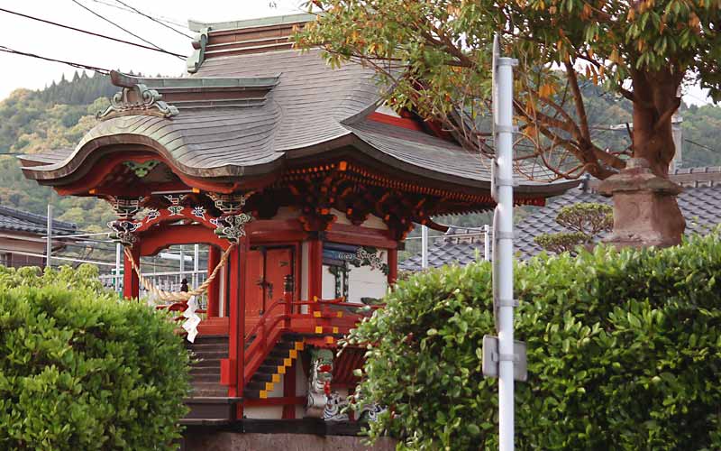 辻の角の保食神社の建物は、元は宮内小学校の所にあった弥勒院脇の白鷺池の弁財天堂で、明治初年の廃仏毀釈の後、現在地に移築された物と伝えられている。神社本殿は、四尺四方の正方形の平面に入母屋造りの屋根を載せ、正面に唐破風が設けられている。